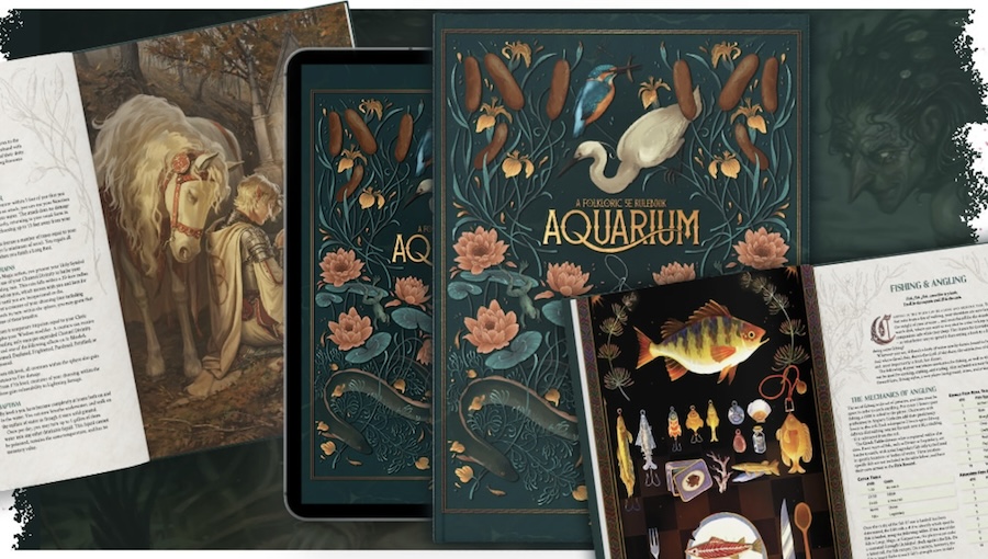 Crown & Crow: Thank you! Aquarium introduces new options, narratives, adventures, and rules to encourage gamers to explore the natural world, particularly freshwater biomes. It’s heavily inspired by real-world folklore and history, and is packed with aquatic magic, fishing mechanics, water monsters, environmental hazards, and thematic adventures tailored to wetter environments such as mythical wells, sacred springs, waterfalls, boglands, and more.