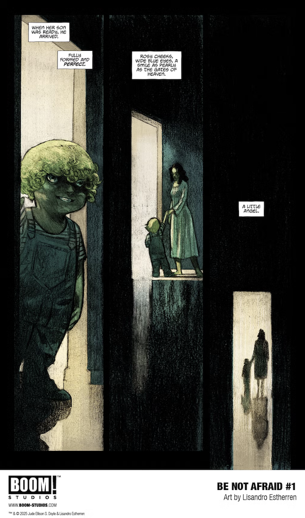 Be Not Afraid, from BOOM! Studio’s, captures that feeling exquisitely and sets a tone that carries from cover to cover. Written by Jude Ellison S. Doyle and illustrated by Lisandro Estherren, Be Not Afraid tells the story of Cora Rehms who – seventeen years give or take nine months – prior to the story kicking off, called out to the powers-that-be asking for a child. As such stories go, Cora was confronted with an angelic-looking entity who she laid with and through the mystical properties of whatever magics were guiding said entity after a painless pregnancy and without needing to give actual birth, and found herself in possession of a cherubic child name Jordy who had no Earthly father.